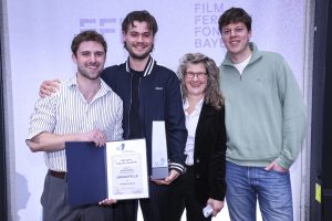 Stephanie Struppler, Geschäftsführerin der VGF Verwertungsgesellschaft für Nutzungsrechte an Filmwerken mbH, überreichte den mit 60.000 Euro dotierten Preis an die Produzenten Felix Mann, Ben Ulrich und Simon Bogocz von WennDann Film GmbH.